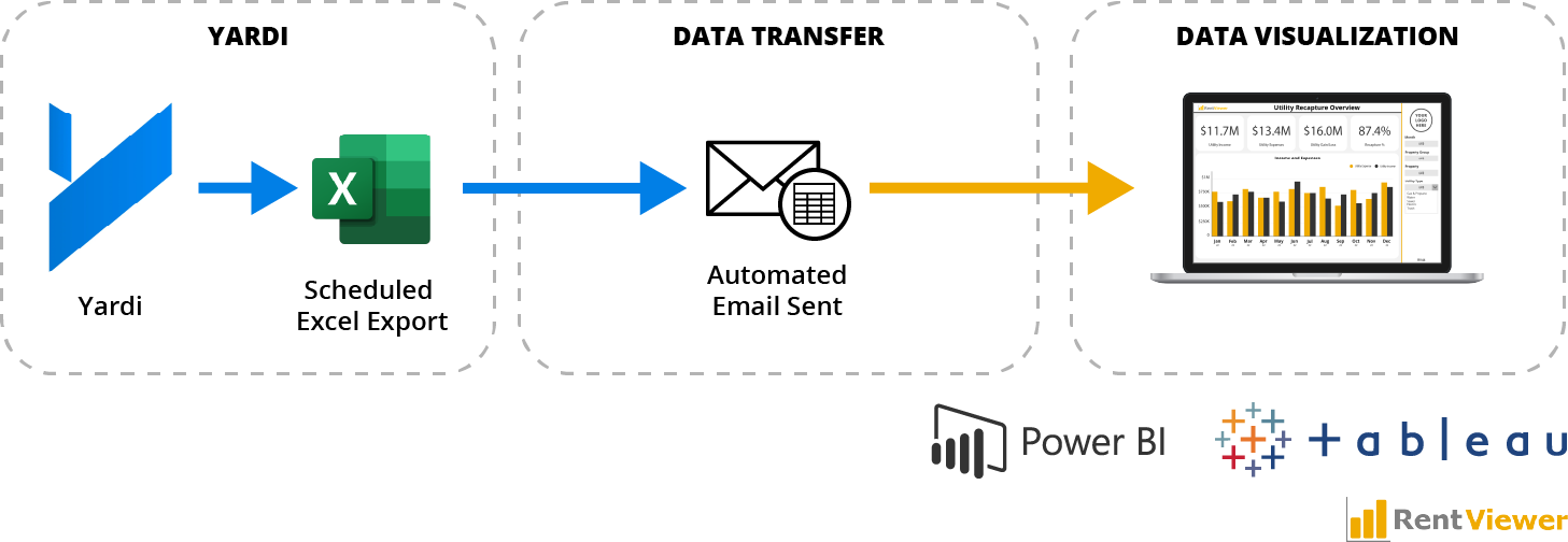 For one RentViewer client, we utilized the Excel-based solution described above. The client had the Yardi Professional Services team custom build a report and schedule it as a daily email. That email arrives in an Office365 inbox, and from there Power BI opens the email, extracts the data in the attached file, and updates the dashboard.